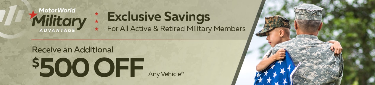 **MotorWorld Military Offer available to active members, retirees, veterans within 24 months of separation of U.S. military branches who are U.S. residents. Must present United States Military ID. $500 offer not valid on previous sales. May be combined with some special offers. Must present coupon at negotiation. Other terms and conditions may apply. See Dealer for details.